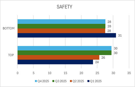 It is noted that two indicators—perceived safety in the event of an accident or train immobilization and perceived safety with regard to incidents of misconduct or unlawful behaviour (security)—are now presented separately, following the implementation of the revised questionnaire from the first quarter of 2025. For this reason, the respective results are presented independently.