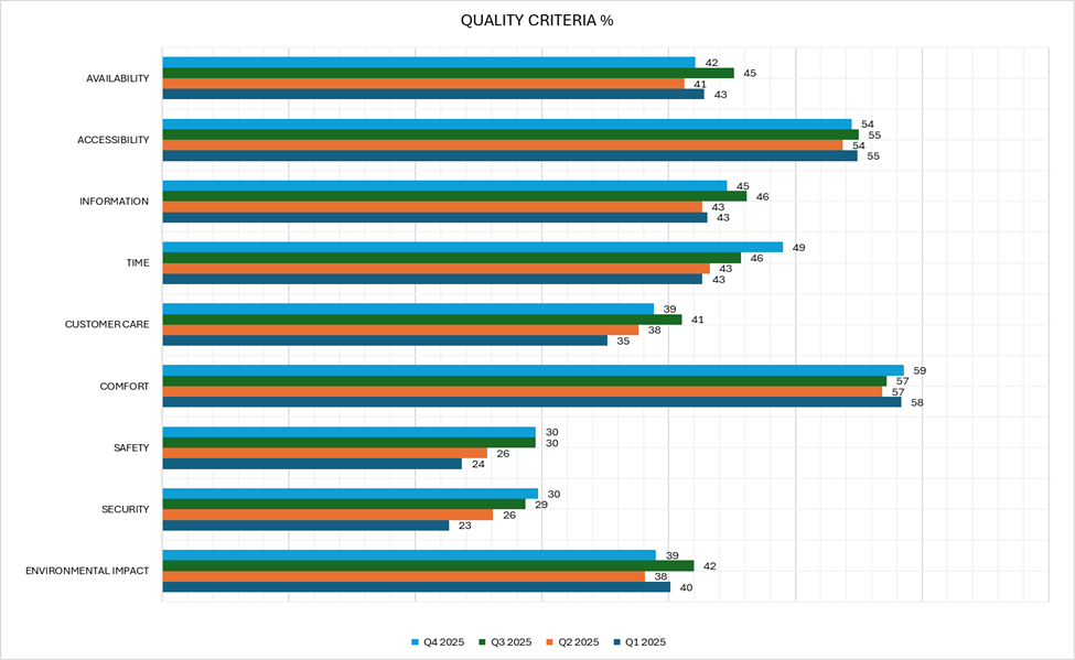 The detailed results of the Quality Indicators of the Passenger Satisfaction Survey for the fourth quarter of 2025, compared with the previous quarters of the same year, are presented below.