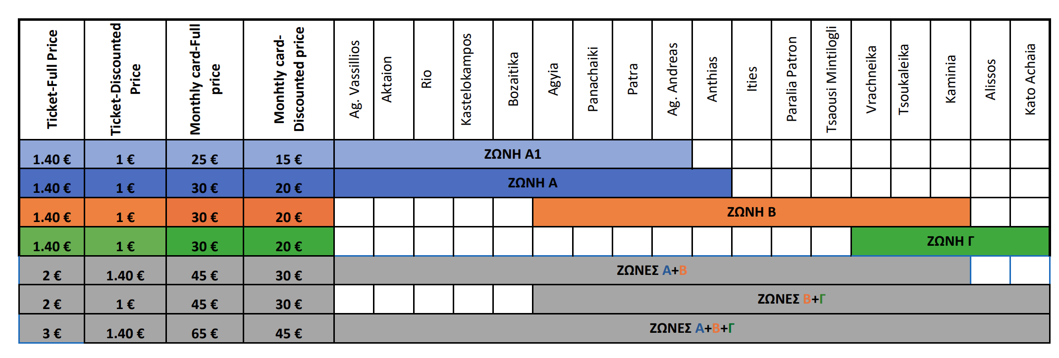 A schematic representation of a complete pricing grid for the Suburban Railway of Patras can be found below: